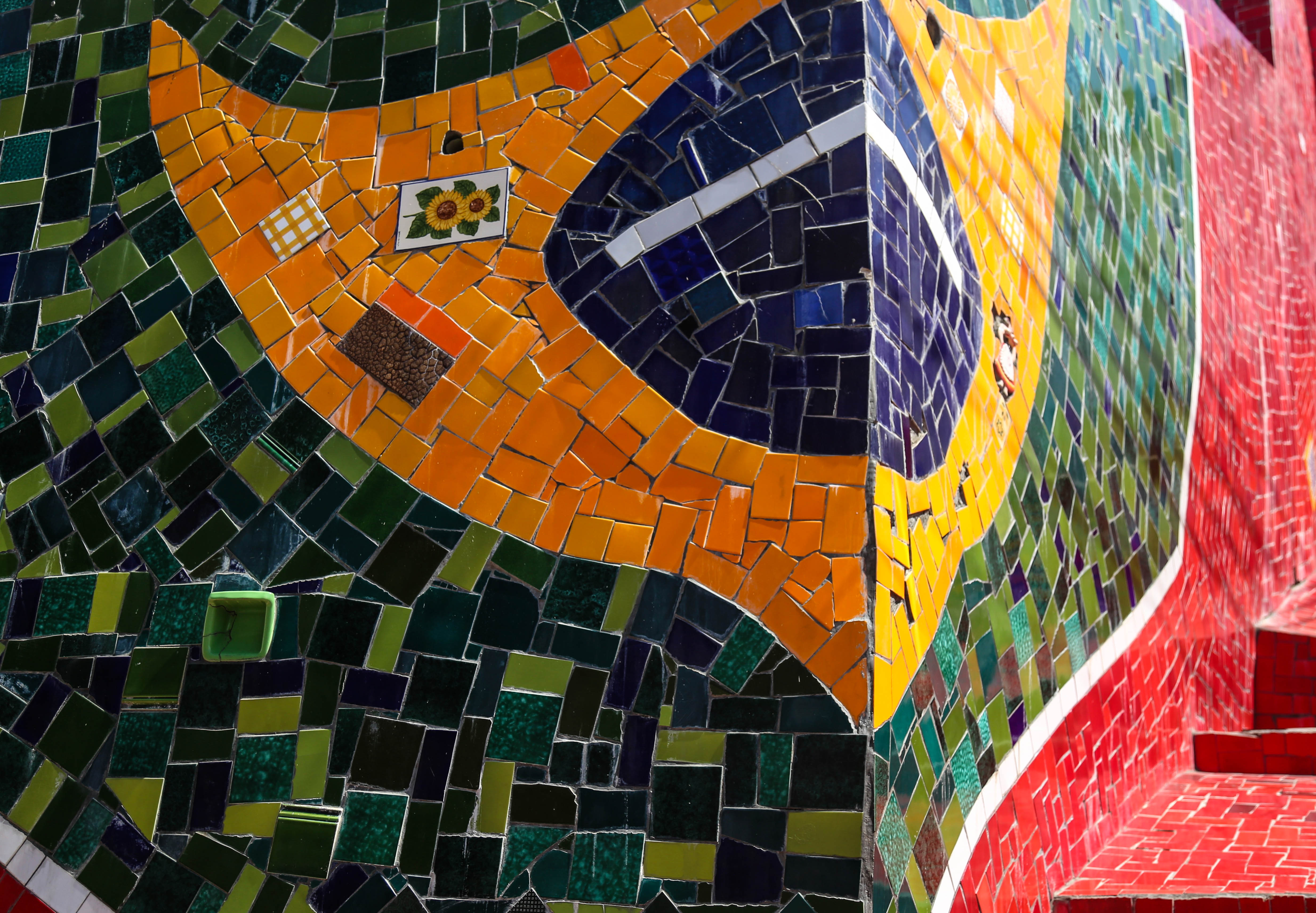 Passage obligé par le célèbre escalier Selarón qui relie les quartiers de Santa Teresa et Lapa (Santa Teresa étant en haut), réalisé en l’honneur de la Coupe du Monde de Football de 1994. En montant les 215 marches de l’escalier (j’avais prévenu ça grimpe !) vous pourrez admirer une partie des 2000 carreaux de faïences venant de 120 pays différents utilisés pour la construction de cette oeuvre d’art, et tout en haut des marches vous serez éblouis par une magnifique mosaïque du drapeau brésilien. Nous avons eu la chance de trouver les carreaux venant de San Francisco ! et vous ?